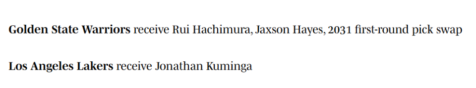 库明加在勇士的命运似乎已成定局。勇士早已在自由市场上兜售库明加,双方分道扬镳已成必然。勇士通过交易得到八村垒,能为球队增添一位外线射手,且球队对他的薪资承诺极低——八村垒将在赛季结束后成为自由球员。海斯也将和这位湖人队友一同进入自由市场,勇士届时可选择让两人离队,也可分别与他们商谈长期合同。